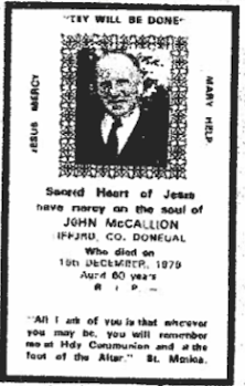 Mass card for John, son of John McCallion, oldest of the McCallion brothers: